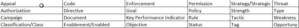 Data element and data element collection names you may encounter that belong to the Motivators BOC include, but are not limited to, names in the following table[ii]. The list gives you a hint of what kind of names to look for in putting together a 6BI Analytic Schema for enabling your data to answer business questions.