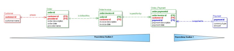 Figure 1 shows a set of binary links between a dependent entity (Order_Payment) and the independent entities with which it has fulfillment dependencies, (Customer) and (Payment). This creates two Dependency Gradients: Dependency Gradient 1, flowing from left to right in the diagram, and Dependency Gradient 2, flowing from right to left. DG1 is a direct relationship (one link), it has no intermediate entities. DG2 is an indirect relationship (three links), there are two intermediate entities, Order_Invoice and Order. The concentration of dependency (i.e., the substance of the gradient) is 100% on the dependent ends (which just happen to be the same entity in this example, but need not be) and 0% on the independent ends.